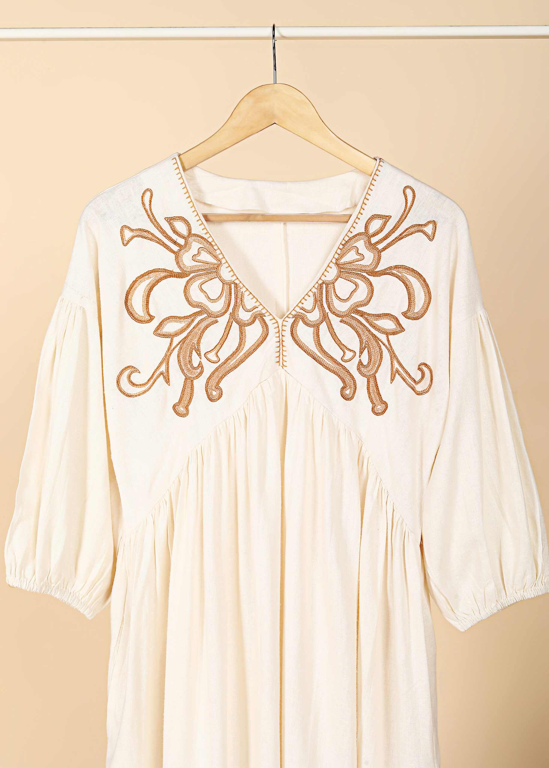 Designed for those who embrace elegance with ease, this embroidered linen midi dress is a blend of sophistication and comfort. Crafted from breathable linen, it drapes beautifully, offering a relaxed yet polished look. The intricate embroidery along the neckline adds an artisanal touch, making it a standout piece for any occasion.